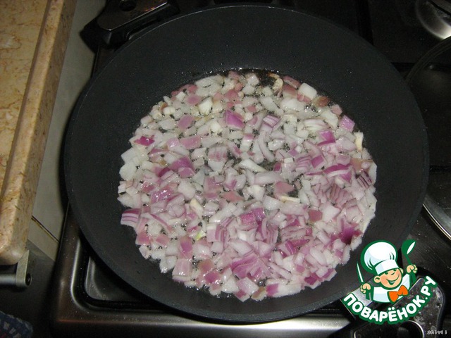 Нарезать лук, обжарить на оливковом масле до золотистого цвета.