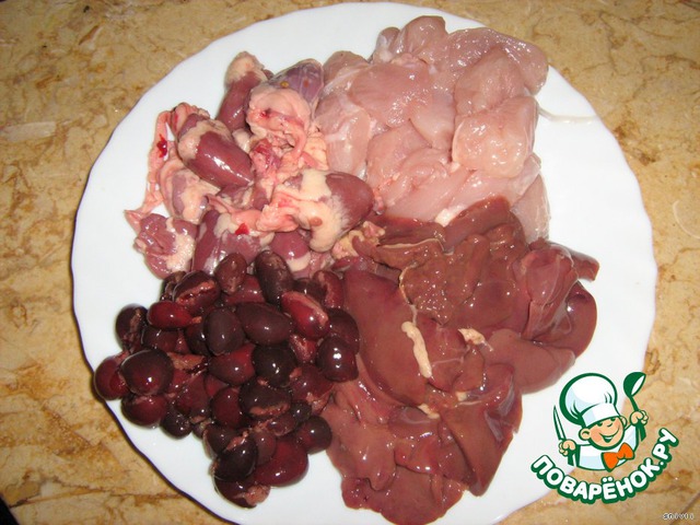 Приготовить мясо. Куриную грудку нарезать кусочками, селезенку и сердечки тщательно промыть, удалив сгустки крови. Куриную печень разрезать на 2-3 части.