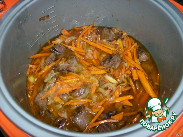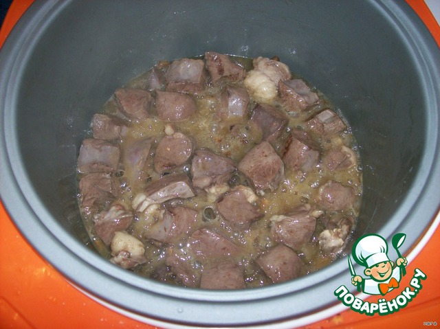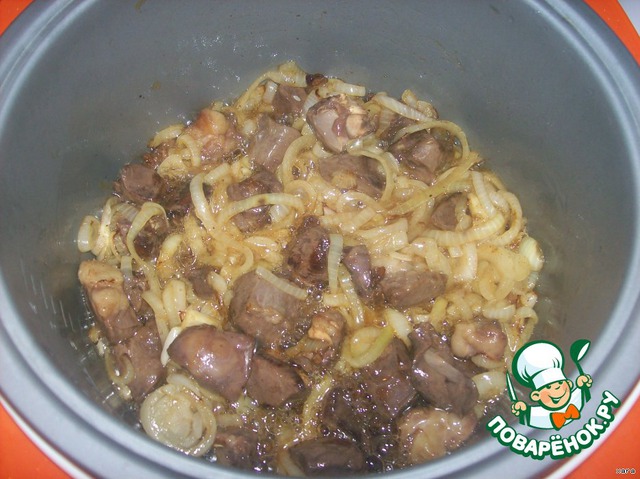 К обжаренному сердцу добавить лук и довести до золотистого цвета при периодическом помешивании.