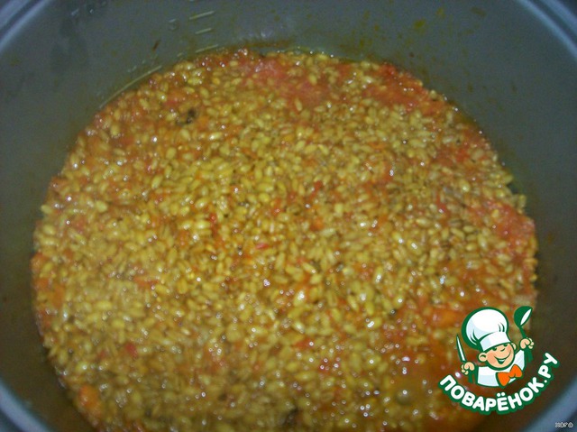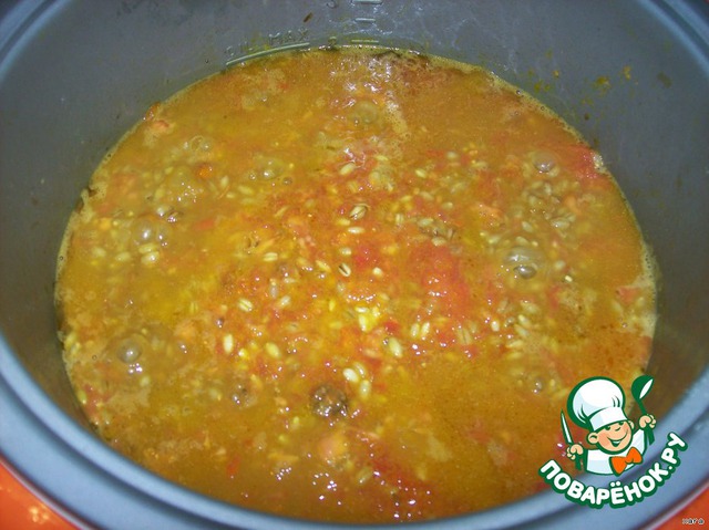 Помидоры протереть через крупную терку без шкурки, вылить на перловку, посолить, добавить еще воды, чтобы она была над поверхностью крупы на 1 см.