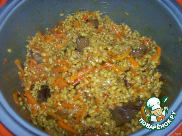 Перловку еще раз хорошенько промыть, выложить сверху на сердце, разровнять.