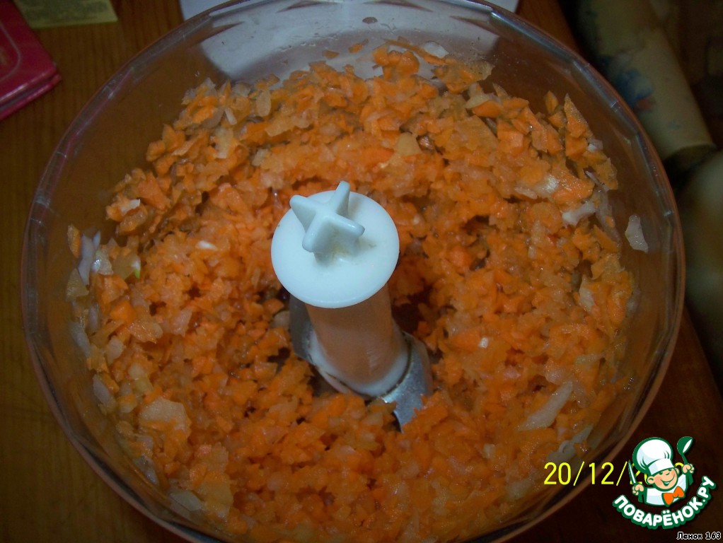 Лук и морковь измельчить в блендере и обжарить.