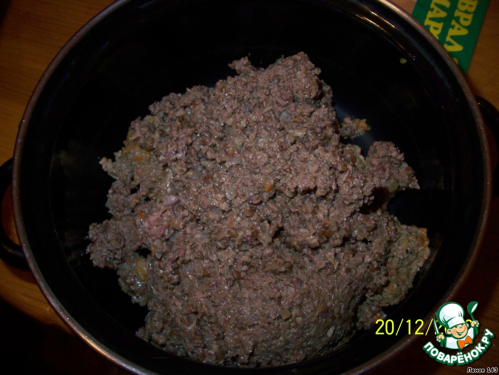 Печенку и овощи измельчить в блендере, добавить гречку и сырое яйцо, посолить, поперчить.