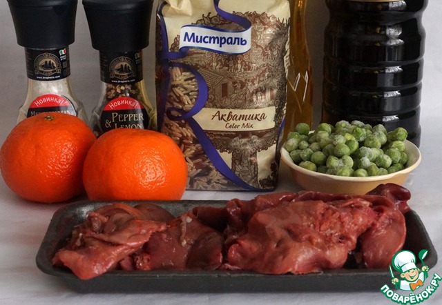 Пока варится рис, печень промыть и нарезать на брусочки. Мандарины разобрать на дольки.