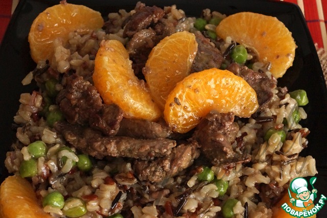 или сервировать так, в центре рис, рядом печень и украсить мандаринами