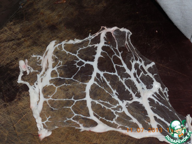 Сетку жировую разложить и нарезать на квадраты так, чтобы поместился один кусочек печени.