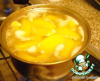 Теперь мой небольшой секрет, который делает простой соус более насыщенным по вкусу: так как перец мы будем гарнировать картофельным пюре, то картошку отвариваем одновременно с приготовлением зажарки. Картошка сварилась, отливаем половину бульона в небольшую кастрюлю, куда также выкладываем зажарку. Картошку разминаем, добавляем немного сливочного масла (можно и не добавлять), потом миксером вбиваем 1 яйцо. Картофель приобретает красивый желтоватый оттенок, комочков быть не должно.