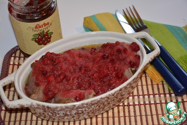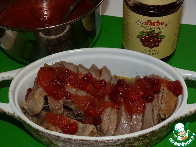 Говяжий язык с яблочно-брусничным соусом можно подать к столу и просто, как закуску.