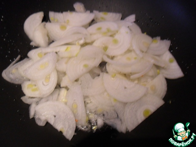 Нарезать лук полукольцами и обжарить на растительном масле до золотистого цвета.