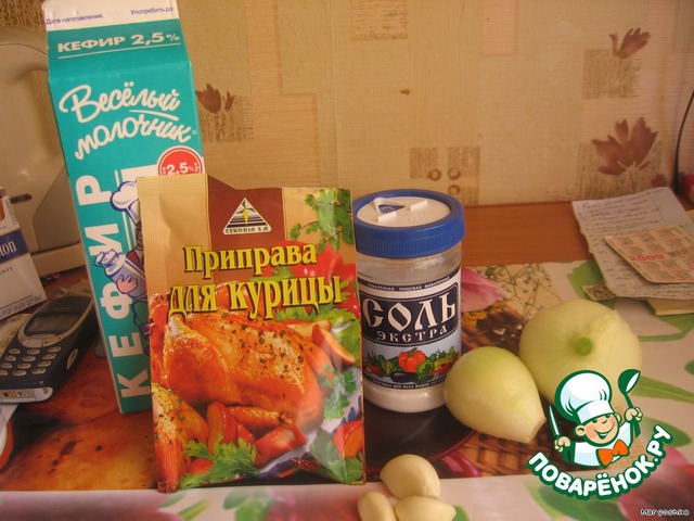 Нарезать лук кольцами, чеснок очень мелко нарезать или натереть на тёрке. Добавить 2-3 ложки растительного масла, залить кефиром, посолить, поперчить по вкусу.
