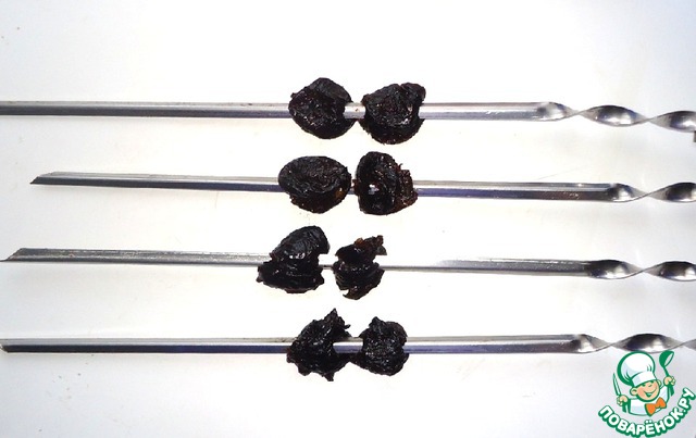 Затем на не очень длинные шампуры или деревянные шпажки нанизываем по 2 - 3 шт. чернослива.