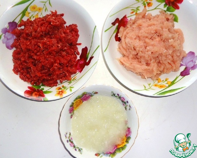 Начинаем готовить нетрадиционные "люля - кебаб" с подготовки ингредиентов. Куриное филе и мякоть говядины пропускаем через мясорубку 2 раза по отдельности, затем пропускаем через мясорубку лук, сливаем с лука сок.