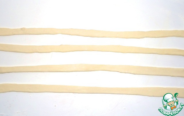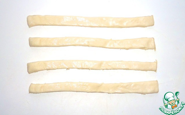 Готовое бездрожжевое (хотя можно взять и дрожжевое на ваш вкус) слоёное тесто размораживаем и режем на полоски ~ 2 см.