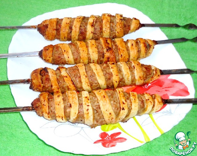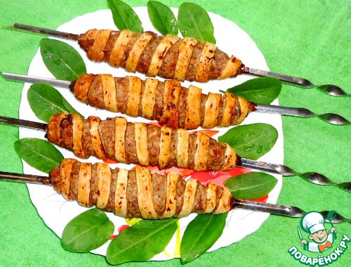 | Как известно люля - кебаб в основном готовят из баранины, но я предлагаю приготовить нетрадиционный люля - кебаб из двух видов мяса с начинкой в слоеном тесте в домашних условиях и взять с собой на пикник. Идею приготовления нетрадиционного люля - кебаб нашла на просторах интернета, очень вкусно и совсем не сложно готовить. |