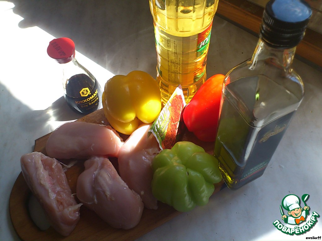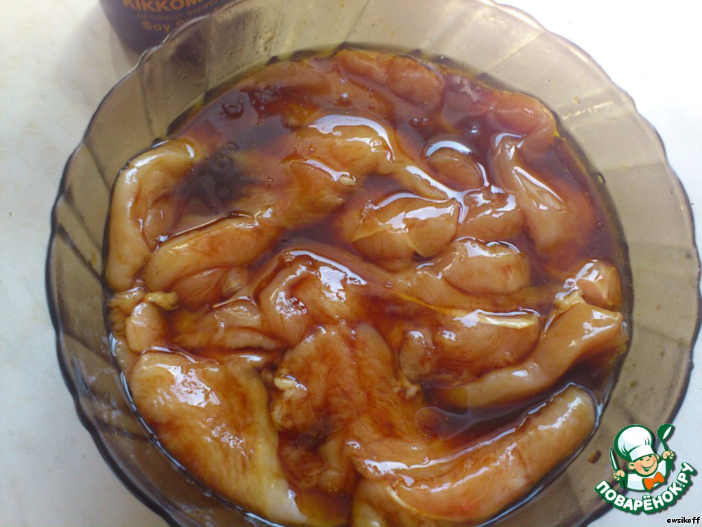 Приготовим маринад: в миске смешиваем соевый соус, оливковое масло, красный перец на кончике ножа, соль по вкусу. Можно и не солить, соевый соус и так соленый, в общем, по вкусу. Курицу заливаем маринадом.