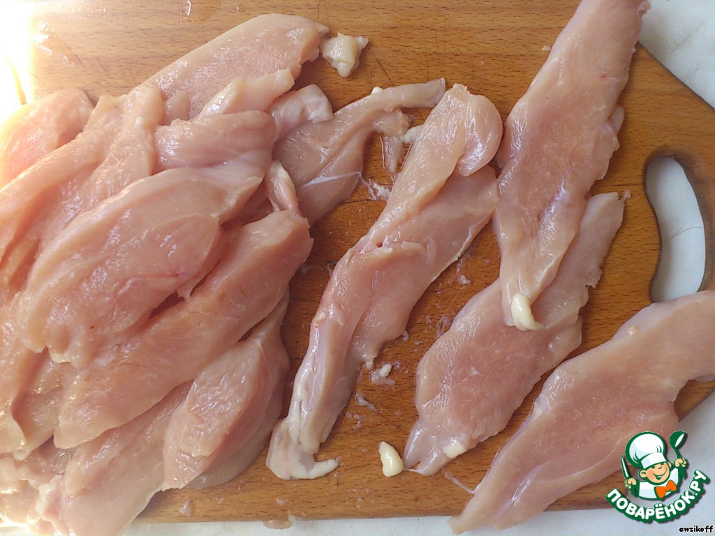 Куриное филе нарезать тонкими длинными полосками. У меня получилась 21 полоска.