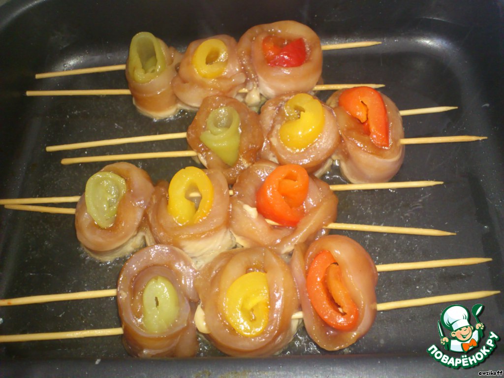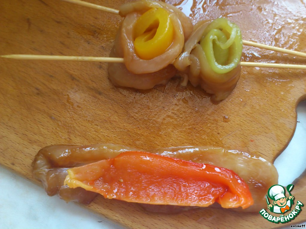 На полоску куриного филе кладем полоску перца и сворачиваем в виде розочки. На каждую шпажку нанизываем по три розочки - зеленая, желтая, красная, чтобы получился светофор.