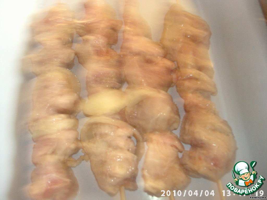 Нанизать кусочки свинины на шпажки, чередуя с репчатым луком.