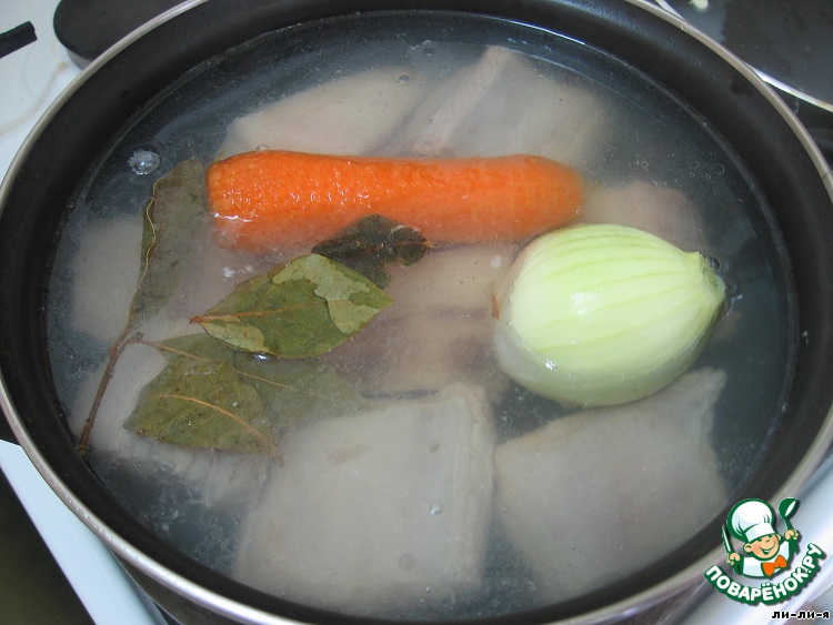 Помещаем куски мяса в кастрюлю, заливаем водой. Добавляем корень петрушки, 1 морковь, 1 луковицу, лавровый листик, перец горошком и соль по вкусу. После закипания варим 20-25 минут. Затем мясо выложить на тарелку и немного остудить.