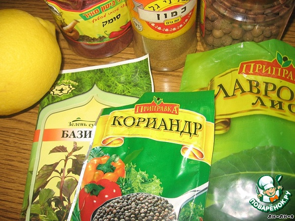 Приправы: черный перец, зира, перец красный сладкий, сумах, кориандр, базилик, лавровый лист.