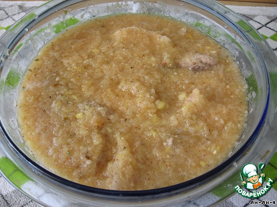 В глубокую посуду помещаем мясо и заливаем маринадом. Перемешиваем и оставляем минимум на 6 часов. Я замариновала вечером и только назавтра днем готовила.