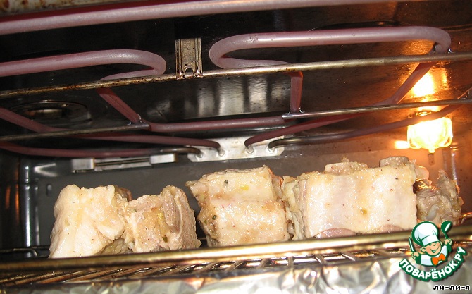 Я готовила в духовом шкафу под грилем на решетке. Снизу надо установить противень, куда будет стекать жир. Жарится очень быстро (по 5 минут) с каждой стороны. Надо постоянно поворачивать куски мяса.