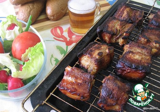 | Рецепт этого блюда был размещен на сайте в 2009 году пользователем hobot под названием "Шашлык из свиных ребер или по модному "Пьяное ребро"", и иллюстрирован мной в рамках акции «Раскраски». Получилось вкусное, мягкое и красивое мясо. |