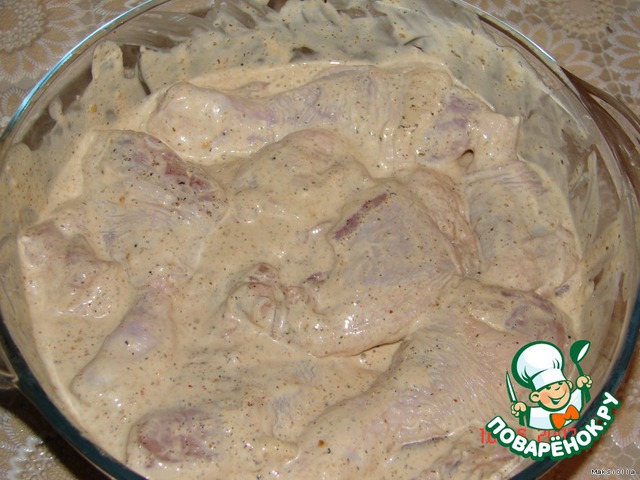 Маринуем окорока в майонезе, лимонном соке, добавляем майоран, тимьян, орегано, перец красный, перец чeрный, паприку сладкую, куркуму, имбирь, укроп сушеный, базилик, мяту, лук и чеснок сушеные.