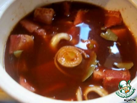 Чай сливаем, отжимаем, добавляем соль, лавровый лист, соус, перец горошком (лучше душистый!).