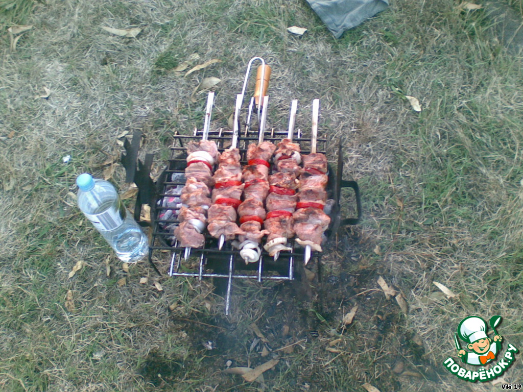 Шампура стоят на сетке, в процессе жарки поливать маринадом + водой, когда с одной стороны будут готовы, перевернуть на другую. На решетке очень удобно переворачивать мясо, никуда не съезжает.