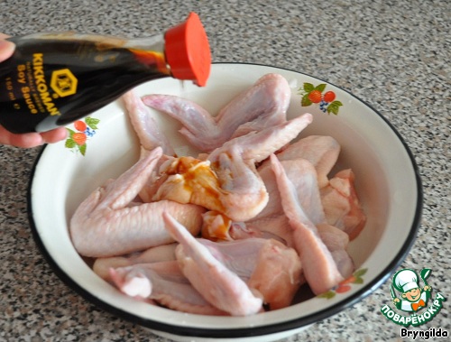 Крылья помыть, залить соусом kikkoman, добавить чикен масалу, каплю соли, перемешать и оставить на 40 мин., можно и в холодильник на ночь. Как Вам удобнее.