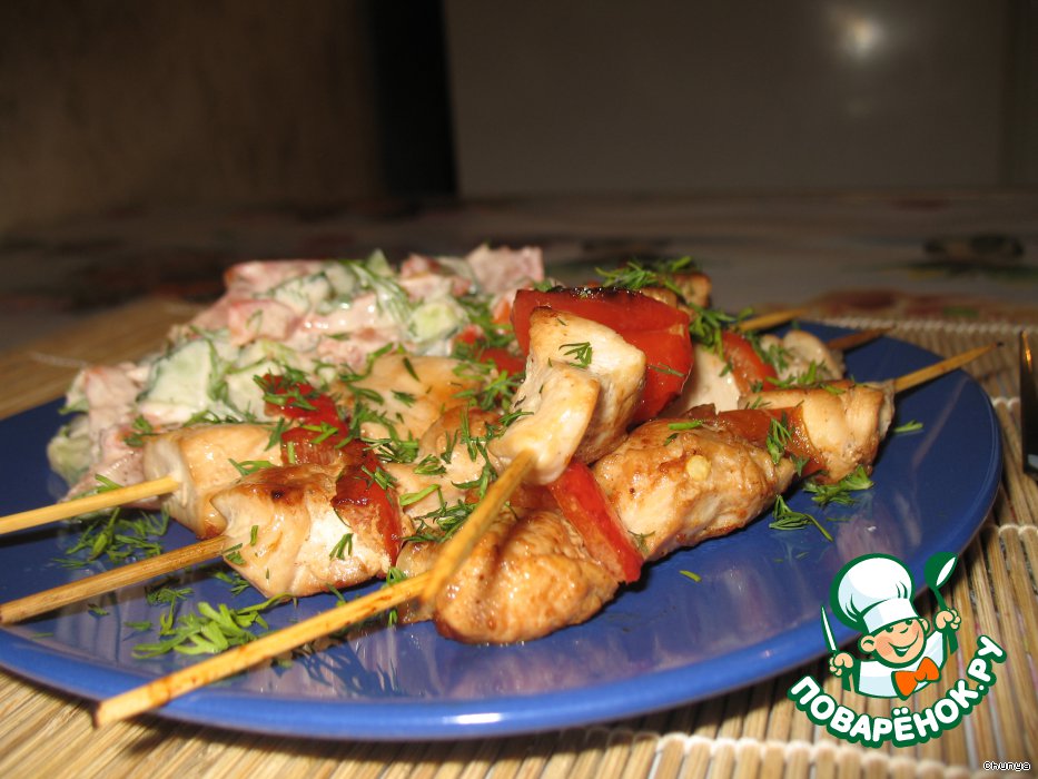 На гарнир я сделала салат из свежих овощей, который отлично дополнил и без того яркую картину лета на нашем столе!