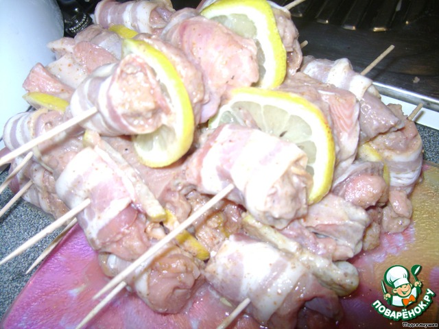 После этого каждый кусочек рыбки (или хотя бы через один) заворачиваем в бекон, так, чтобы бекон был со всех сторон, и надеваем на шампуры, периодически надевая и дольки лимона.