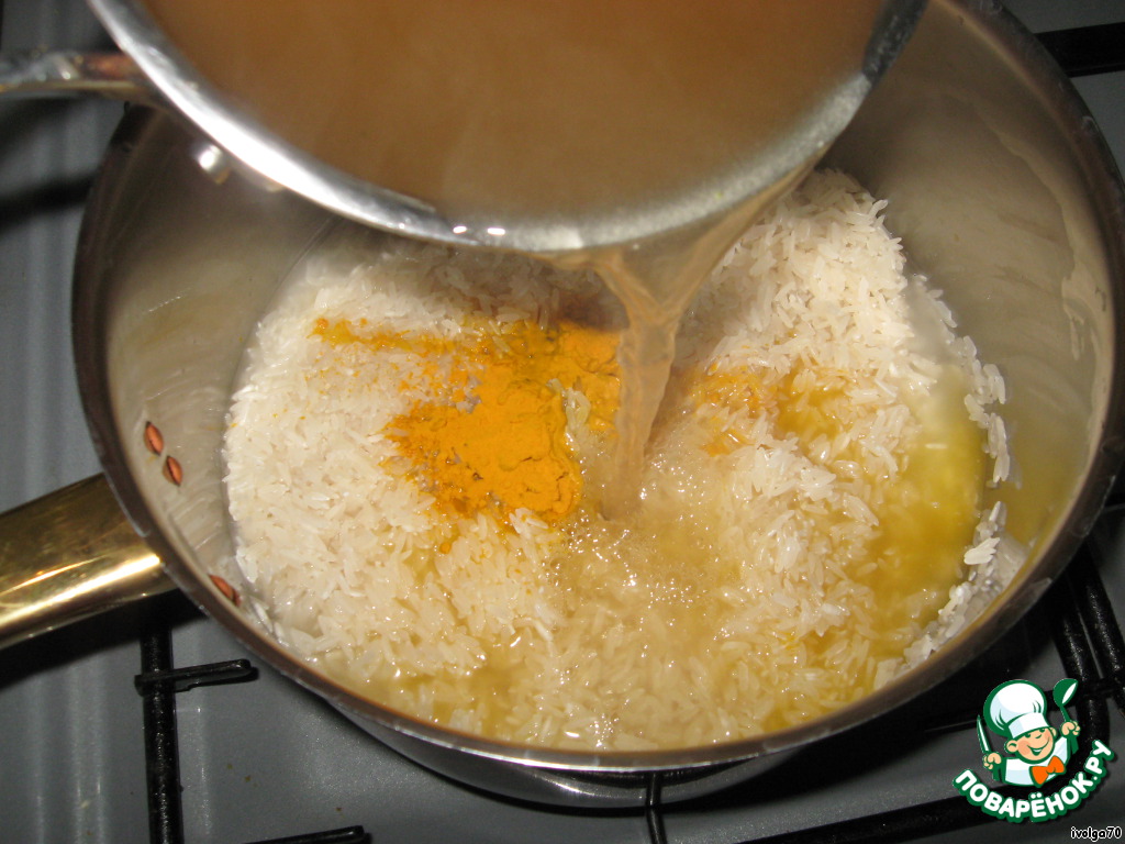 Моем рис, добавляем куркуму и заливаем бульоном. Доводим до кипения, время от времени помешивая, затем варим на маленьком огне 5 минут.
