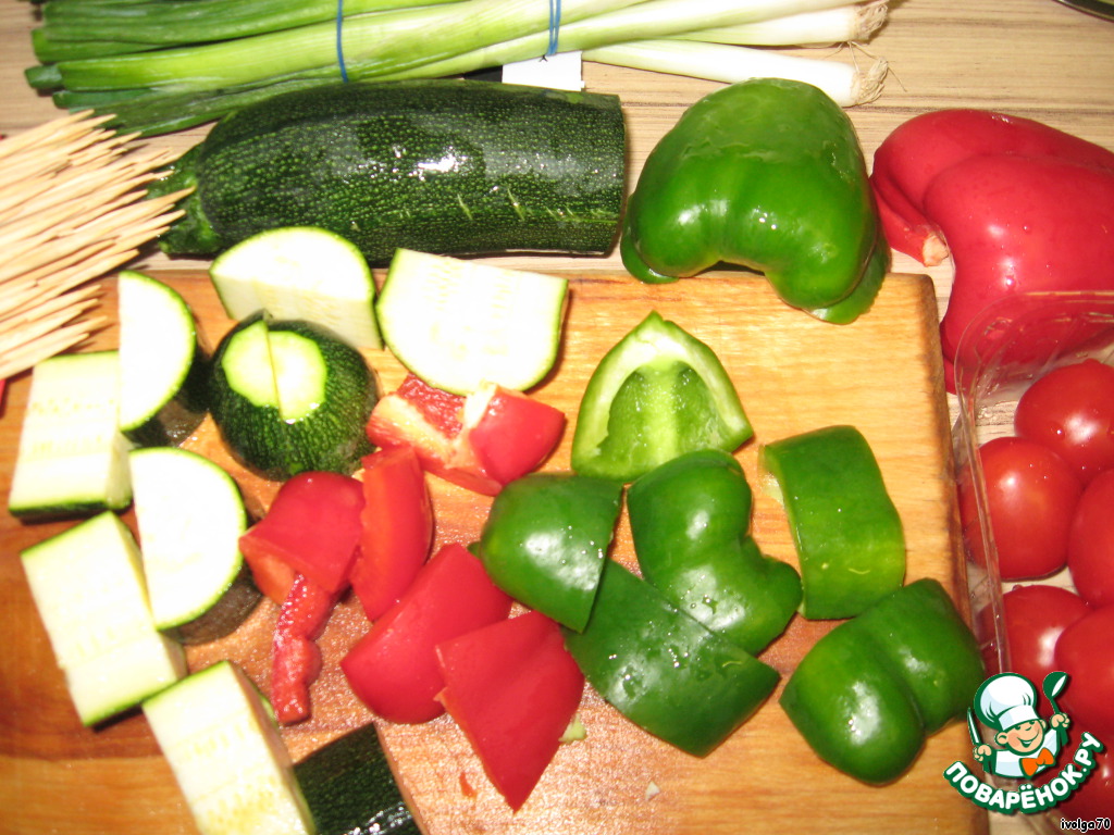 Нарезаем овощи. Цуккини и перчики кусочками, зеленый лук по 2.5 см длиной.