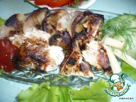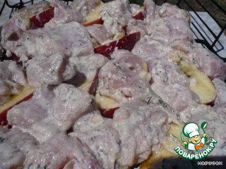 | Шашлык из куриного филе, запеченный на гриле вместе с яблоками. Рецепт маринада для курочки и технология запекания шашлыка с яблоками. |
