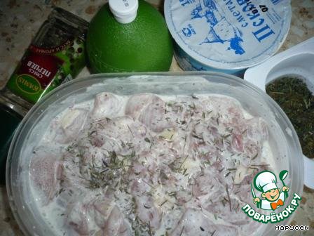 Замариновала курочку за день и через пару часов маринования на столе отправила в холодильник на ночь. Для маринада смешала: сметану, розовое полусухое вино, сок лайма, немного "придавленный" лезвием ножа чеснок , тимьян, мяту, розмарин, соль, белый перец.