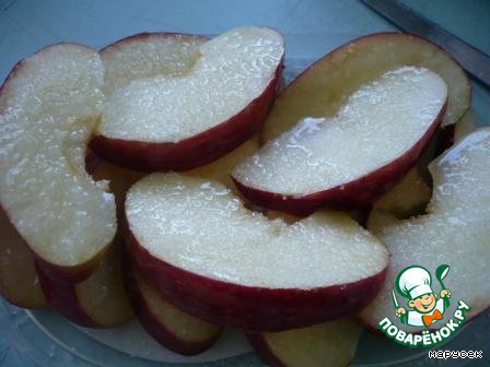 Затем готовим шашлык. Режем яблоко на дольки, присыпаем сахаром (медом) и сбрызгиваем растительным маслом.