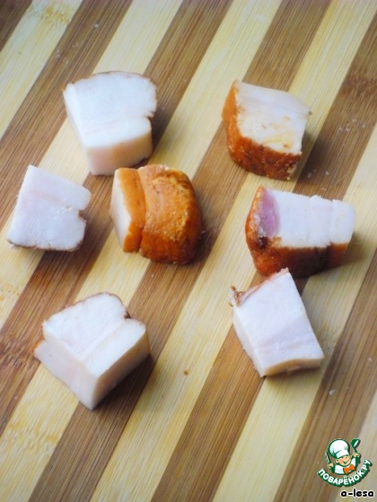 Нарезать кусочками (по размеру курицы) шпик, желательно использовать подкопченный.