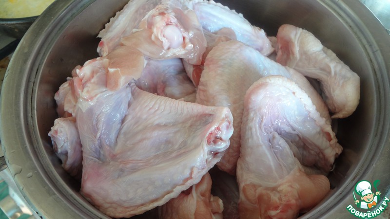 Куриные крылья хорошо промыть и отчистить от остатков перьев. "Пальцы" отрезать. Есть там нечего, а на бульон пригодятся))).