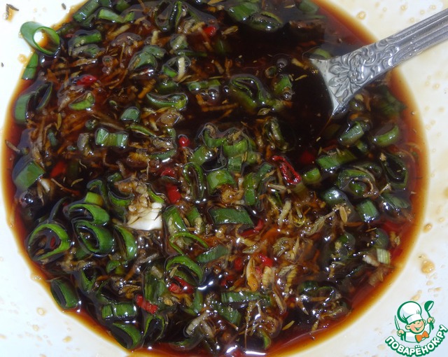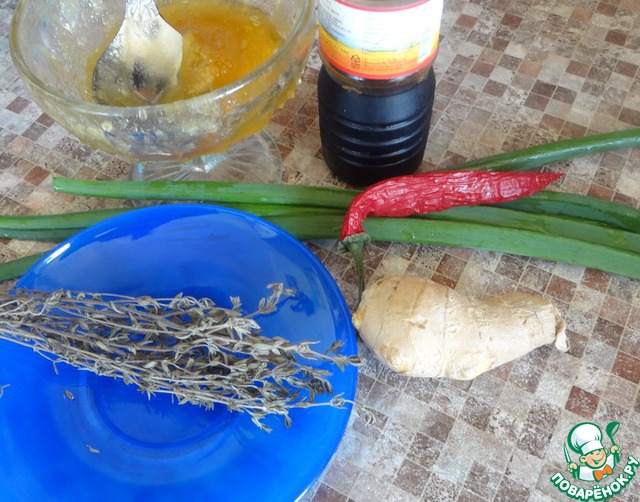 Приготовить мёд, соевый соус, 5 листочков зелёного лука, 1 перец чили, сухой тимьян, чеснок и кусочек имбиря.