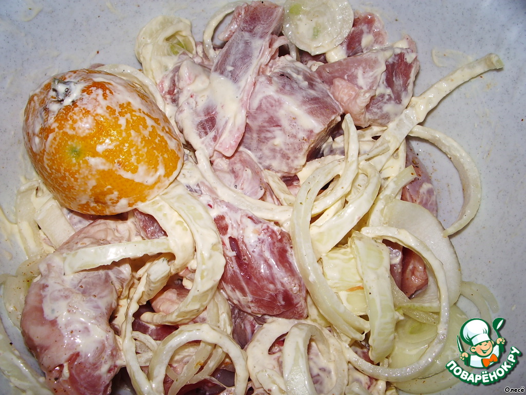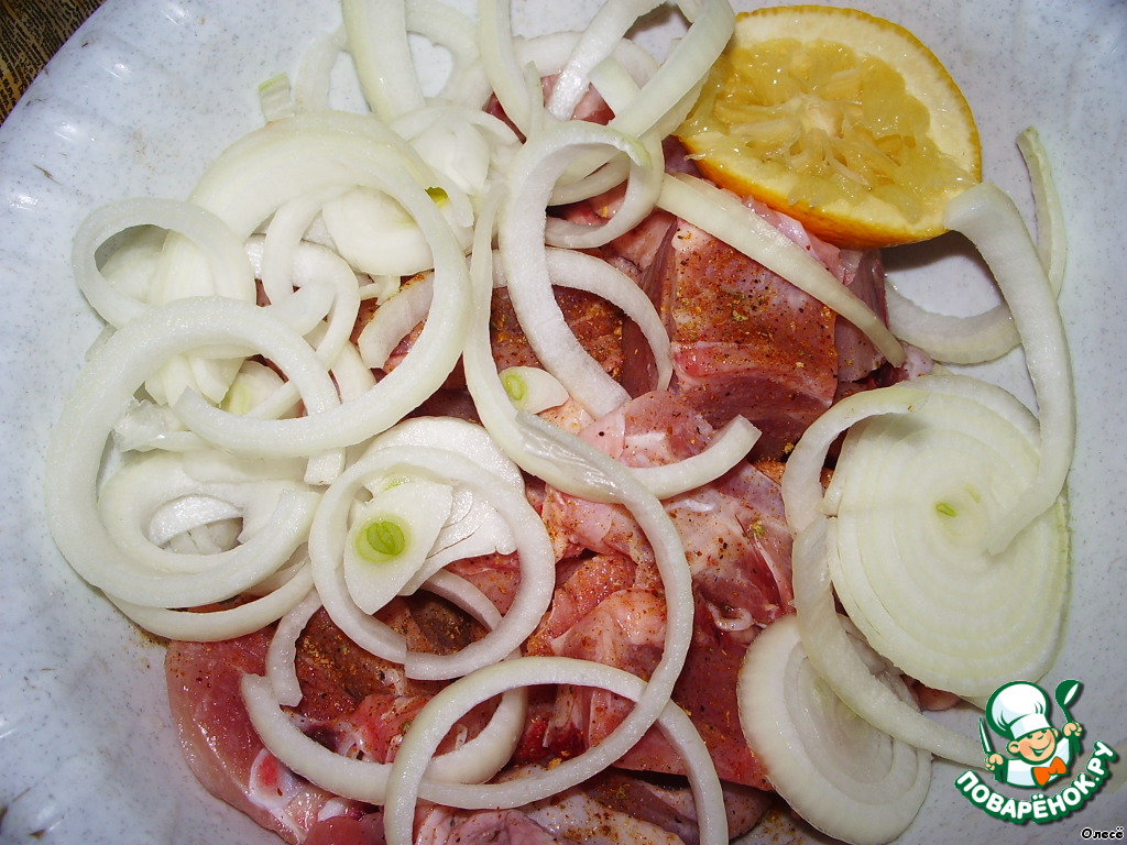 Натереть солью, специями, дать постоять 5 минут. Затем выдавить сок лимонов, добавить уксус.