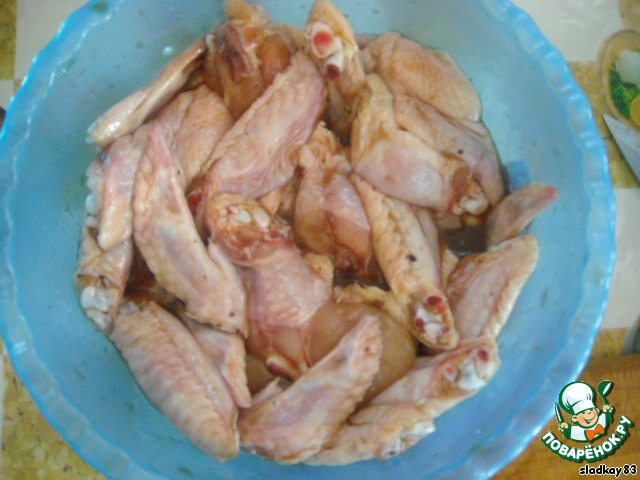 Замариновать крылья в соусе не менее, чем на 2 часа.