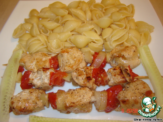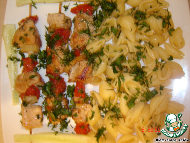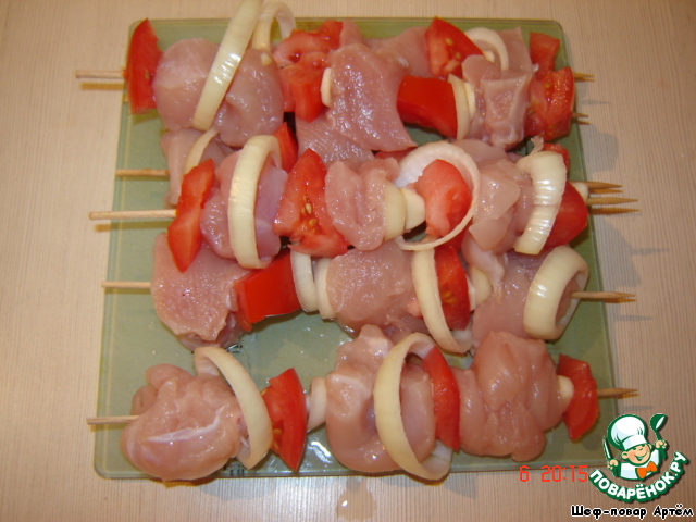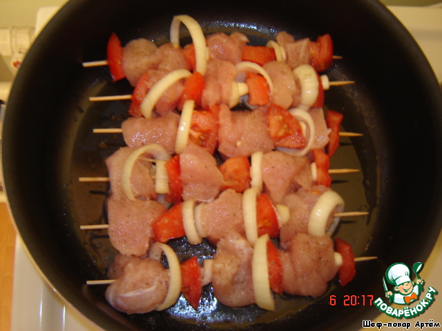 На шпажки нанизать помидор, филе, лук, чеснок.