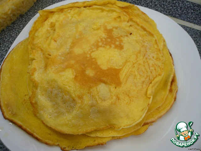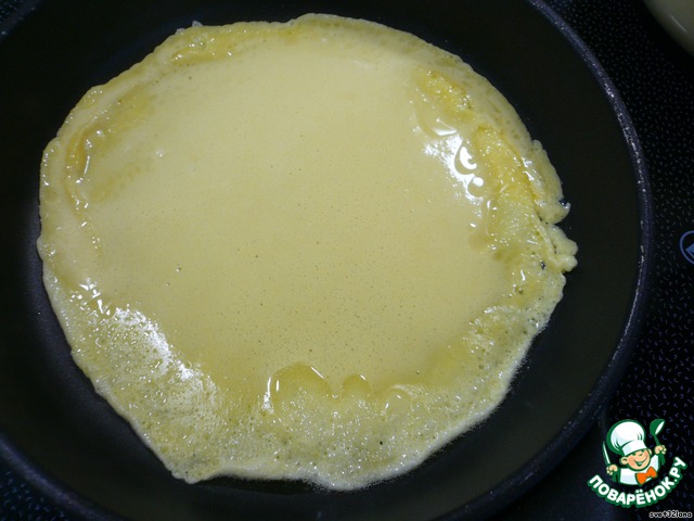 Испечь омлеты в виде блинчиков. На каждый омлет у меня ушло по столовой ложке раст. масла.