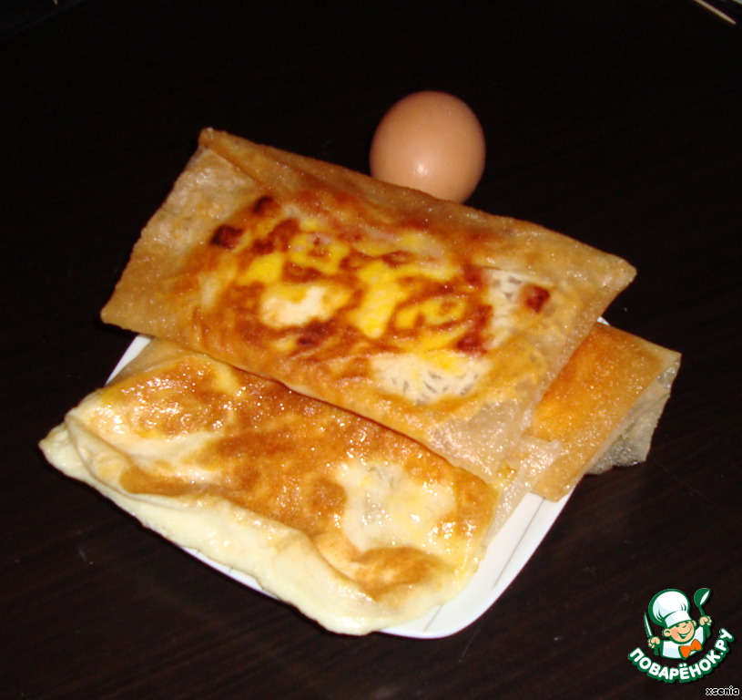 Я люблю первый вариант. Очень нежно получается. Муж мой любит посытнее. Тогда я сначала кладу немного тертого сыра, порезанной ветчины. Затем яйцо. А дальше все так же. Заворачиваем, жарим.