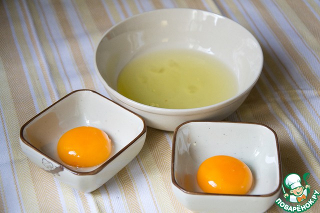 Яйца комнатной температуры отделить от желтков. Каждый желток поместить в отдельную чашку.