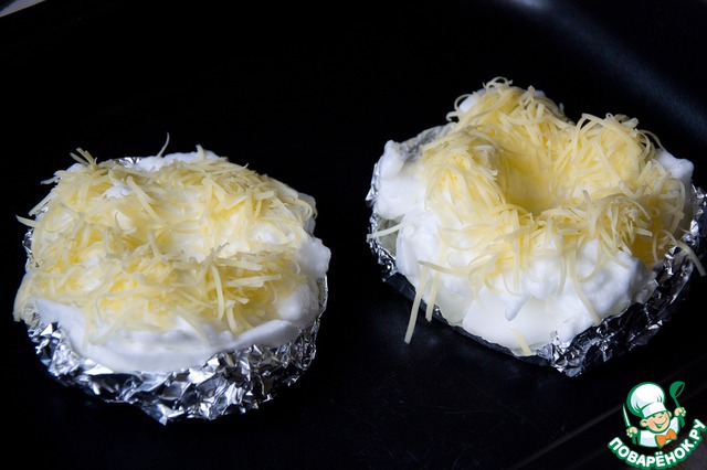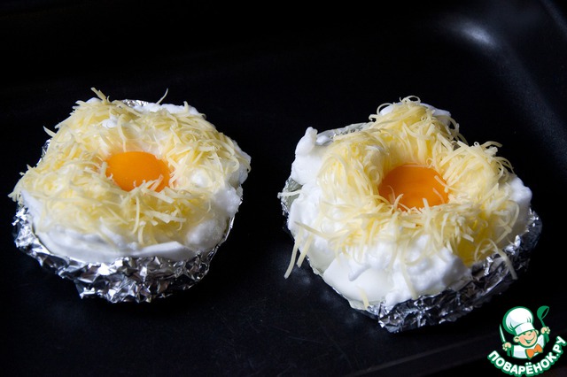 Выложить белки в форме шарика и сделать в центре углубление ложкой. Посыпать тертым сыром.