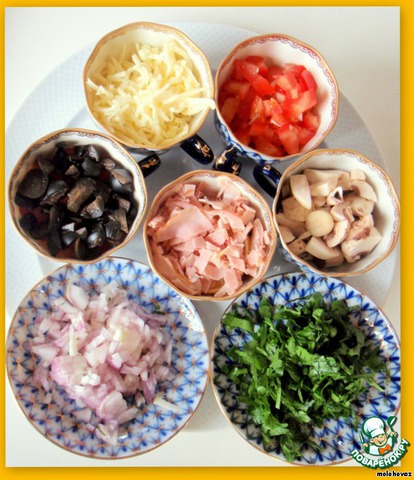 Как можно мельче нарезать помидоры, шампиньоны, ветчину, лук, зелень, маслины, натереть сыр...