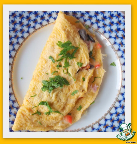 Я затем убавляю температуру и прикрываю крышкой. Через пару минут, когда омлет хорошо схватится и прожарится с нижней стороны, аккуратно перевернуть.